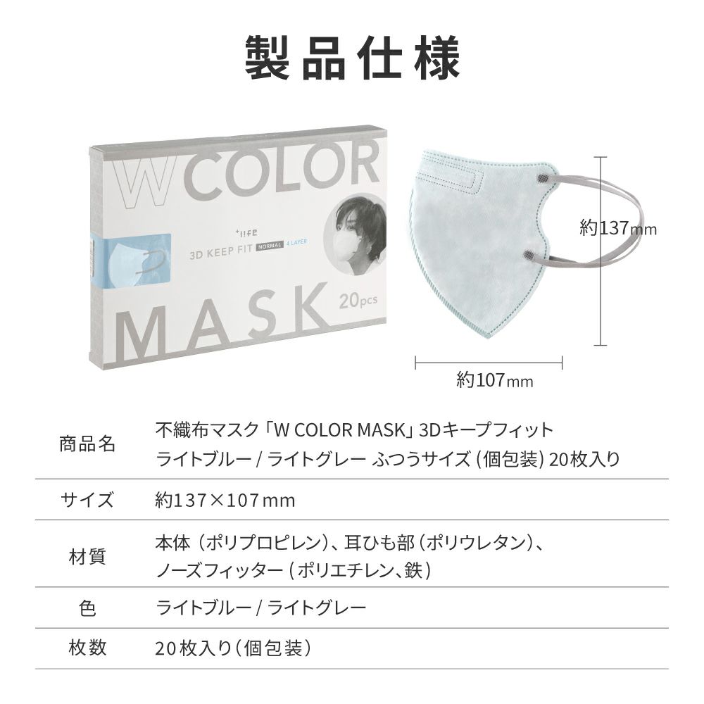 他の画像を見る 【メール便 送料無料】不織布マスク W COLOR MASK 3D キープフィット ライトグレー/ライトブルー 20枚入 通常 ¥ 780 のところ ¥ 449 税込 在庫切れ お気に入りに登録する
