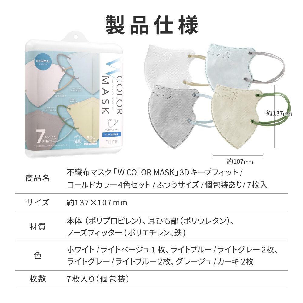 他の画像を見る 【メール便 送料無料】不織布マスク W COLOR MASK 3D キープフィット コールドカラー4色セット 7枚入 初回限定クーポン 通常 ¥ 800 のところ ¥ 499 税込 在庫切れ お気に入りに登録する
