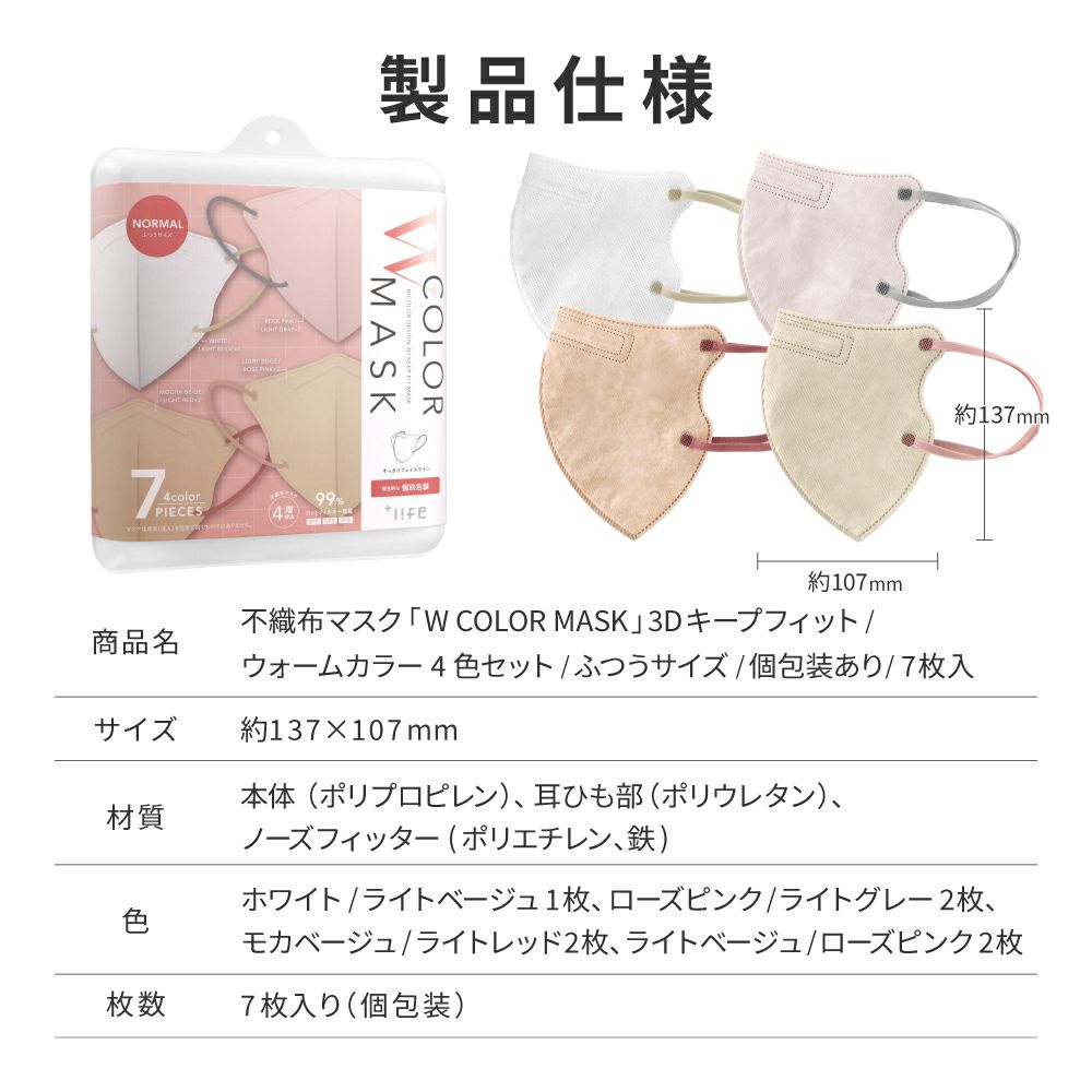 他の画像を見る 【メール便 送料無料】不織布マスク W COLOR MASK 3D キープフィット ウォームカラー4色セット 7枚入 通常 ¥ 800 のところ ¥ 499 税込 在庫切れ お気に入りに登録する