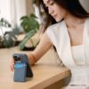 - MagSafe対応の3in1カードホルダー/二つ折りデザインのコンパクトなミラー/ハンズフリーで使用できる卓上スタンド/スリムなカードホルダー/MagSafe非対応端末やケースに取り付け可能な導電性両面粘着テープ付きシリコンスナップリング付属