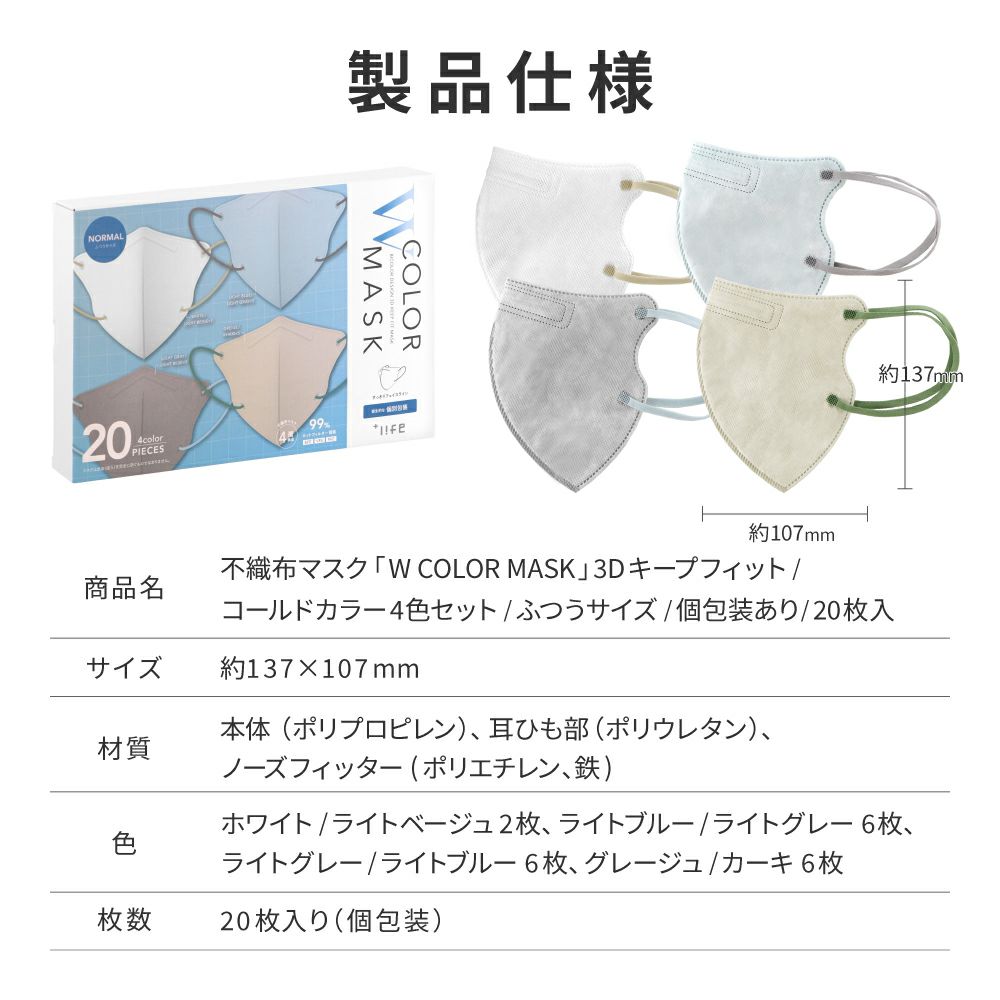 他の画像を見る 【メール便 送料無料】不織布マスク W COLOR MASK 3D キープフィット コールドカラー4色セット 20枚入 通常 ¥ 780 のところ ¥ 299 税込 在庫切れ お気に入りに登録する