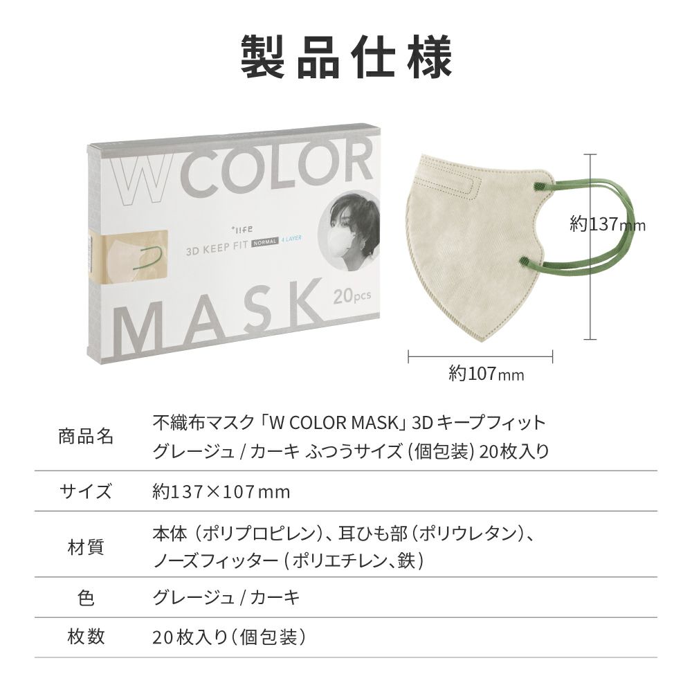 他の画像を見る 【メール便 送料無料】不織布マスク W COLOR MASK 3D キープフィット グレージュ/カーキ 20枚入 通常 ¥ 780 のところ ¥ 299 税込 在庫切れ お気に入りに登録する